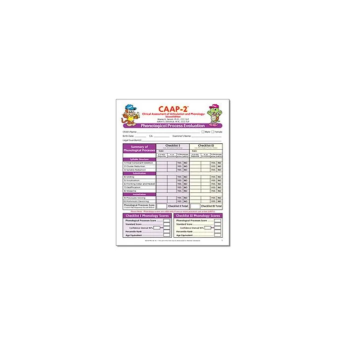 The CAAP-2 assesses articulation and phonology in children. It is time-efficient, accurate, and yields results that are easy to score and interpret. The checklist approach to assessing phonological processes virtually eliminates the need for phonetic transcription. The CAAP-2 is designed so that children will enjoy its administration. It helps you qualify students for therapy with word standard scores, sentence standard scores, and phonology standard scores.