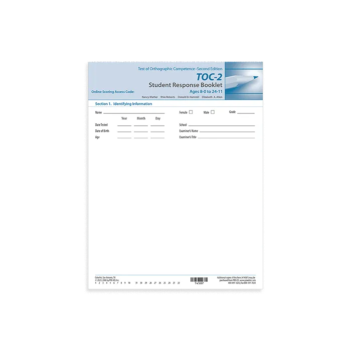 The Test of Orthographic Competence–Second Edition (TOC-2) assesses aspects of the English writing system that are integral to proficient reading and writing. These aspects include letters, spelling, punctuation, abbreviations, and special symbols. The TOC-2 now has a single form that can be administered to individuals or groups. Normed on a national representative sample of 1,512 individuals, it yields standard scores and percentiles for both subtests and composites. Classroom teachers, special education teachers, reading specialists, school psychologists, speech pathologists, or any other professionals with some training in standardized test administration can use the TOC-2.